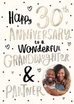 Front of card: Featuring 1 circular photo area surrounded by hand-lettered black script and shimmering silver typography, all on a white background scattered with heart & polka dot illustrations.br> Text reads: "Happy 30th anniversary to a wonderful granddaughter & partner."