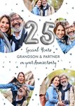 Featuring 5 photo upload areas, 2 of which are heart-shaped with a large silver no "25" balloon, with script text below, all on a white background with confetti.