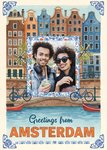 Front of postcard: Features illustrated Amsterdam canal houses, complete with bicycles, boats and a traditional blue and white border framing your own photo.