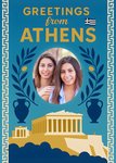 Front of postcard: A vibrant blue and gold design inspired by classical Greece: laurel branches, twin amphorae pottery and an illustrated Parthenon frame a circular space for your own photo beneath text.