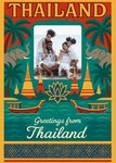 A vibrant design packed with Thai flavour, with lush palm trees, elephants, ornate temple spires and colourful long-tail boats frame a space for your own holiday snap. Rich teal, amber and sunset reds echo traditional patterns.