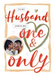 Front of card: Valentine's Day Photo Upload Card Hand painted typography with hearts and a circular photo frame. Text reads: "To my Husband you're my one & only".