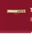 Front of card: Crafty handmade looking card with hand-stamped style dots and stars surrounding a photo frame. The background is of textured, red craft sugar paper.
