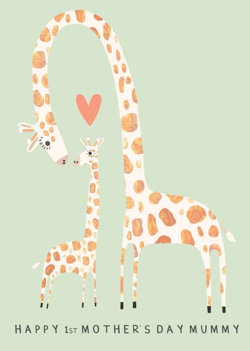 A sweet and sentimental 1st Mother's Day card featuring a loving illustration of a mummy giraffe and baby giraffe with a heart between them. The soft pastel green background and delicate design make this the perfect card to celebrate a special Mummy’s first Mother's Day.