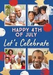 A festive 4th of July card designed with a blue background, red, white, and gold stars and paint splats. The layout features a collage of five family photographs showcasing multiple generations and smiling faces. The central text is in bold, patriotic colours.
