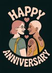 An illustrated greeting card featuring two smiling people facing each other, with small hearts between them, detailed with tattoos and accessories, set against a dark green background.