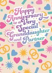 Greeting card featuring lilac, teal, and purple flowing script on a white sticker, wishing a happy anniversary to a very special granddaughter and partner, surrounded by colourful hearts, stars, and rings on a cream background.