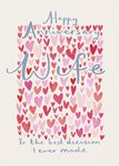 A heartfelt greeting card featuring hand-painted pink and red hearts surrounding the message “Happy Anniversary Wife” in soft script, all set against a light cream background.