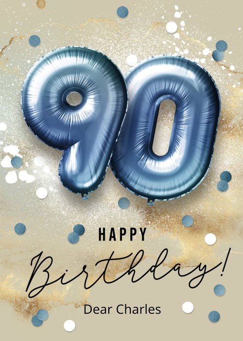 Featuring large blue foil number balloons and an editable message surrounded by confetti dots and foil details on a cream background.