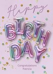 Featuring large pastel foil balloon letters spelling “birthday” beneath a handwritten “Happy” greeting, surrounded by scattered multicoloured and gold confetti, with a rectangular panel for a personalised message, on a soft pink background.