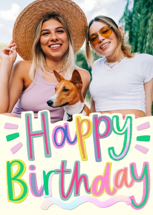 A modern design featuring colourful hand-lettered text on a cream background below a large rectangular photo upload area.