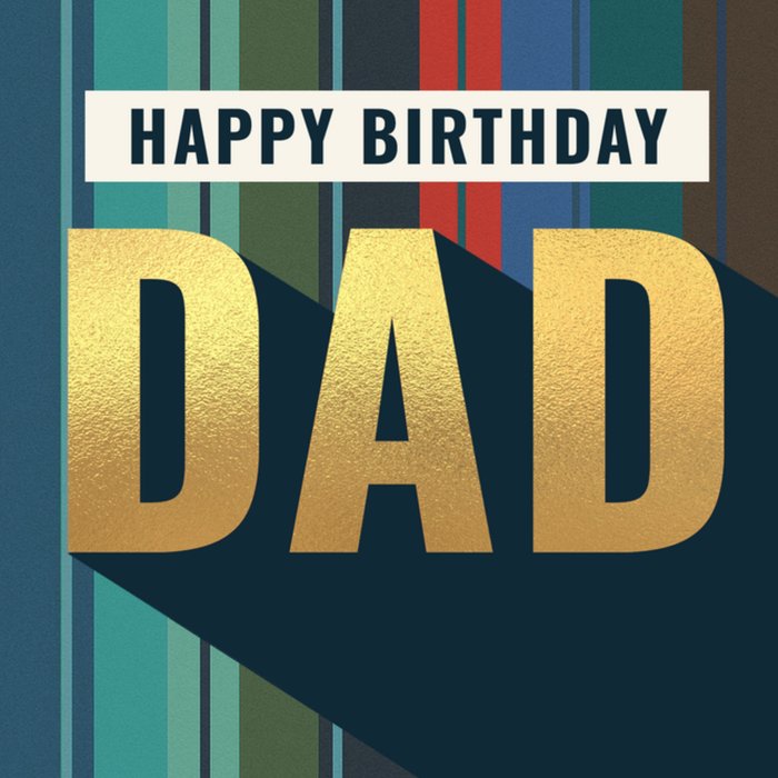 Featuring bold gold lettering with a long shadow effect on a striped blue-and-green background, this greeting card uses strong typography to celebrate a birthday.