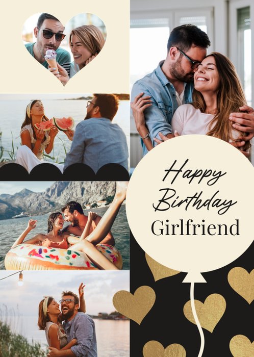 Featuring five collage-style photo frames with gold hearts and a cream balloon containing an editable birthday message, on a black background.