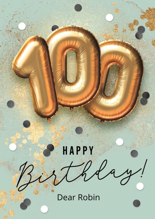 Featuring large gold foil number balloons and an editable message surrounded by confetti dots and gold foil details on a mint green background.