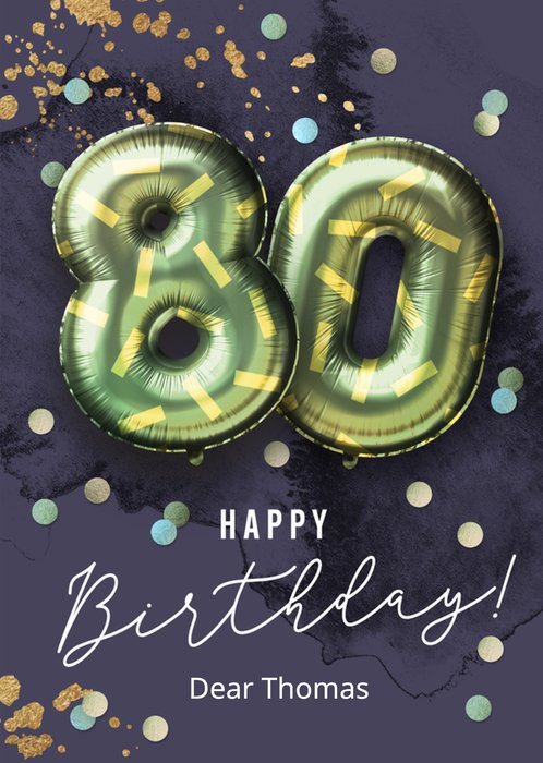 Featuring large green, patterned foil number balloons and an editable message surrounded by confetti dots and foil details on a navy blue background.