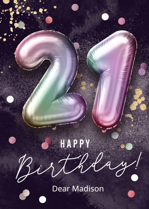 Featuring large pink rainbow foil number balloons and an editable message surrounded by confetti dots and gold foil details on a dark purple background.
