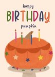 Sweet illustrated birthday card with a pumpkin birthday cake and playful typography.