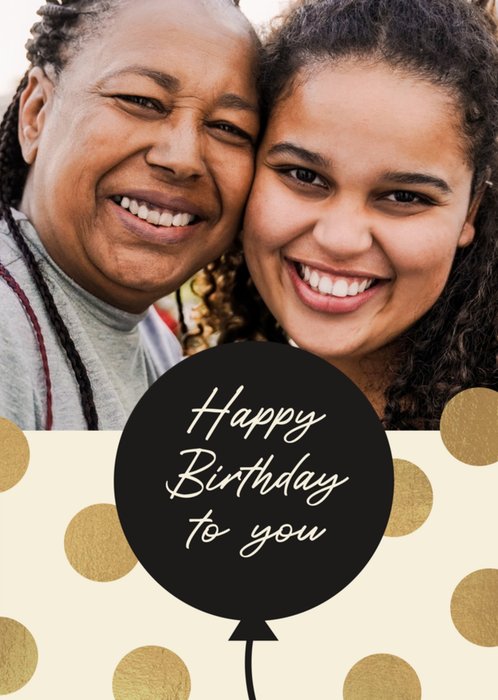 Featuring one photo area above a black balloon illustration with a hand-lettered birthday message and gold polka dots on a cream background.