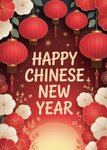 A warm, traditional design featuring red hanging lanterns with gold details, surrounded by red and white blossom flowers and leaves on a deep red background.