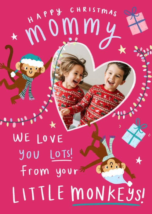 A bright pink Christmas greeting card featuring playful illustrated monkeys wearing winter hats and scarves. A heart-shaped photo area in the centre shows two smiling children in festive jumpers, surrounded by fairy lights and gift drawings.