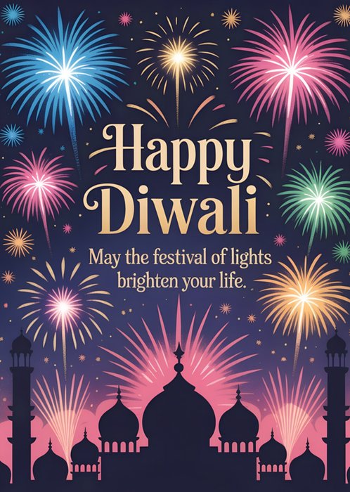 Elegant night scene with colourful fireworks bursting above a silhouetted domed skyline, set against deep blue and purple tones with soft golden highlights.