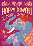 A modern, colourful design featuring hand drawn text and an illustration of an elephant adorned with decorations. The design is framed by ornate swirls, icons and leaves and sits on a textured background.