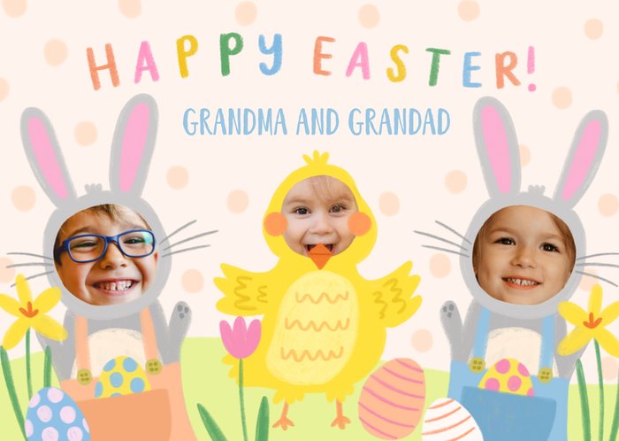 A cute design featuring an illustration of a yellow chick and two bunnies with photo areas over the faces, surrounded by Easter eggs and spring flowers on a cream polka dot background.