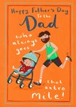 A vibrant greeting card with an orange background shows a cheerful illustrated dad in running gear pushing a giggling baby in a pram, with bold and playful text celebrating Father’s Day and his tireless effort.