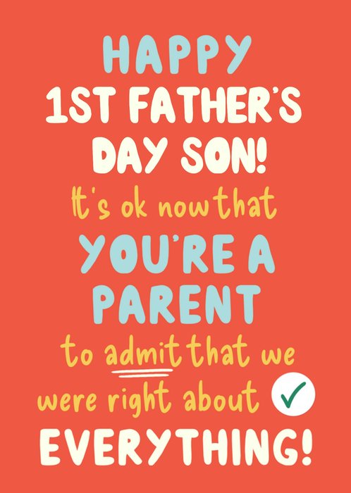 Text reads: "Happy 1st Father's Day son! It's ok now that you're a parent to admit that we were right about everything!". 'Happy 1st Father's Day son!' can be personalised!