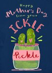 A cute, playful design featuring two smiling pickle illustrations in a jar with bold hand lettering on a dark blue background.