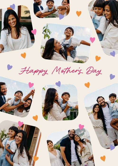 Featuring a Mother’s Day greeting card with eight rounded-corner photo frames in a scattered collage, small colourful heart icons, and a cream background with a large script message in the centre.