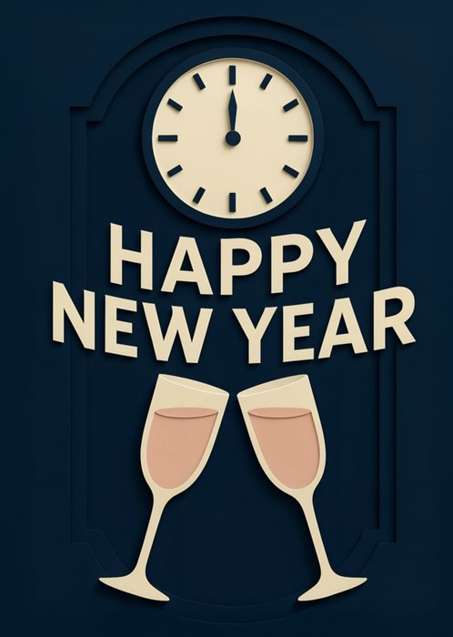 Featuring a bold typographic New Year greeting with a midnight clock and two clinking champagne glasses on a dark blue background.