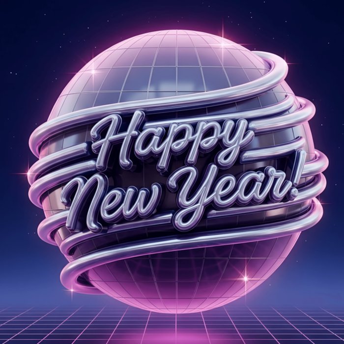 Featuring bold chrome script wrapped around a mirrored disco ball with a neon glow and an 80s grid horizon, on a dark blue background.