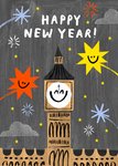 A cheerful design featuring Big Ben with a smiley clock face surrounded by colourful fireworks and stars on a dark charcoal background.