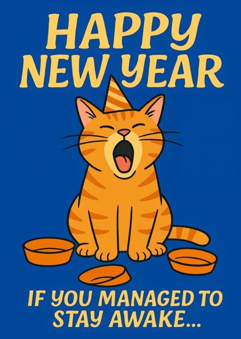 Featuring a yawning ginger cat in a party hat, on a bold blue background.