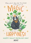 Front of card: Featuring an illustration of a cat wearing a crown amongst foliage with four leaf clovers. Text reads: "May your day be touched with a bit of magic and lots of happiness Happy Saint Patrick's day Jackie!". 'Jackie!' can be personalised!