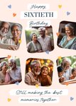 A modern, sentimental design featuring a centralised Birthday message separated into two by six square photo upload frames. The design is set against a soft peach background with colourful scattered hearts.