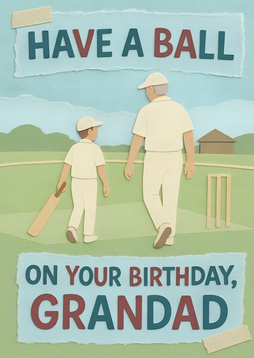 A fun design featuring a paper cut style illustration of a grandad and child walking on a cricket pitch with a bat and stumps on a light blue background.