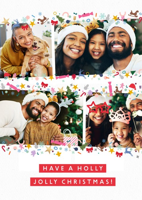 A cheerful Christmas design featuring four rectangular photo upload frames surrounded by a colourful festive border of stars, snowflakes, candy canes, crackers, and holly. The background is white, and the bottom of the card features bold red text panels.