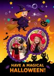 A magical design featuring a cute witch character riding a broomstick, surrounded by cat, bat and star icons. Below the character there is space for two oval photo uploads and a Halloween message.
