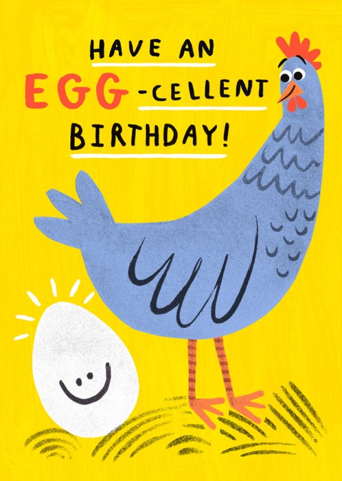 Featuring a fun illustration of a chicken next to a smiling egg, with a brush-style message above. The design sits on a yellow textured background.
