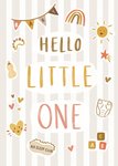 A soft, hand-lettered design featuring text in muted colours on white frames surrounded by cute baby themed icons, on a striped background.