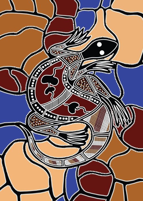 Illustration of a lizard on brown and blue background with Aboriginal art pattern.