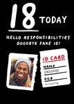 Front of card: Bold white chalkboard style text above a white identification card which has been torn in half on a black background. The name and date of birth on the card is editable Text reads: "18 today. Hello responsibilities. Goodbye fake I D. I D card. Name. Freddie. D O B 10. 02. 2004. " With customisable name and D O B