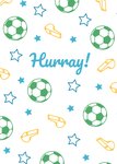 This greeting card features a white background adorned with green footballs, yellow whistles, and blue stars in a playful, repeated pattern.