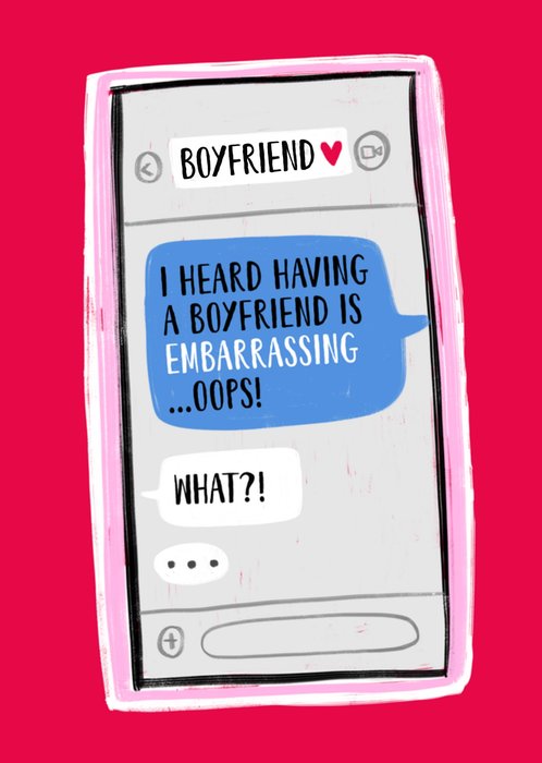 Featuring an illustration of a smartphone showing a playful text message exchange. The blue message bubble reads a cheeky comment, while the white bubble below reacts in surprise. A small heart appears next to the word “Boyfriend” at the top of the phone screen.