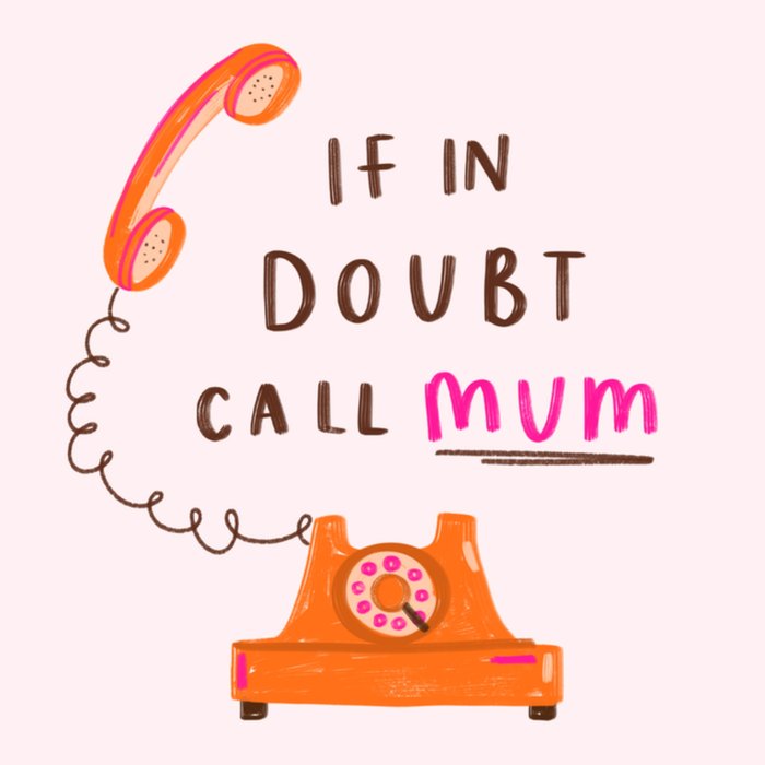 A humorous design featuring an illustrated orange retro rotary telephone with hand drawn lettering on a light pink background.