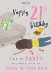 Front of card: Illustration of girl lying on floor next to sofa and takeaway chips surrounded with glittery stars on a grey background. Editable name at the top with large pink painted number 21 and hand-written text above and below illustration Text reads: “Taylor Happy 21st Birthday time to party and wake up with chips in your hair" With customisable name.