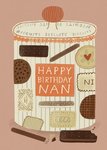 Features an illustration of a biscuit tin with a variety of biscuits for the tin design. There is text in the centre of the tin and a half eaten chocolate finger and bourbon biscuit next to the tin.