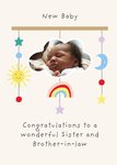 Cute illustration of a baby mobile that has hanging stars, a sun and a rainbow. A photo upload frame in the center of the mobile in the shape of a cloud. Text at the bottom of the card reads: "Congratulations to a wonderful Sister and Brother-in-law